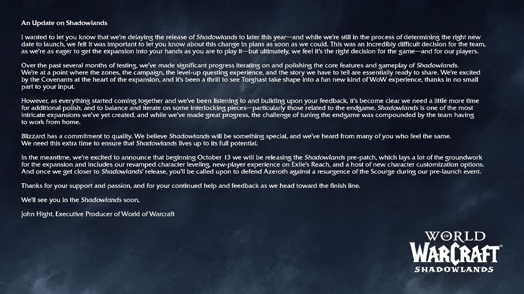 Well it happened, World of Warcraft’s next expansion Shadowlands has been delayed to some time later this year. Blizzard released a statement explaining they want to continue to polish the expansion and balance the endgame content. Shadowlands has many systems that rely on each other, making Blizzard reporters worried by the lack of finishing norms lately. People had expected pre-patch by Sept. 29th. An event before an expansion that narratively ushers in the next story while implementing the changes to already established systems. There were also major changes coming to beta at a time when the team should be just making small adjustments.