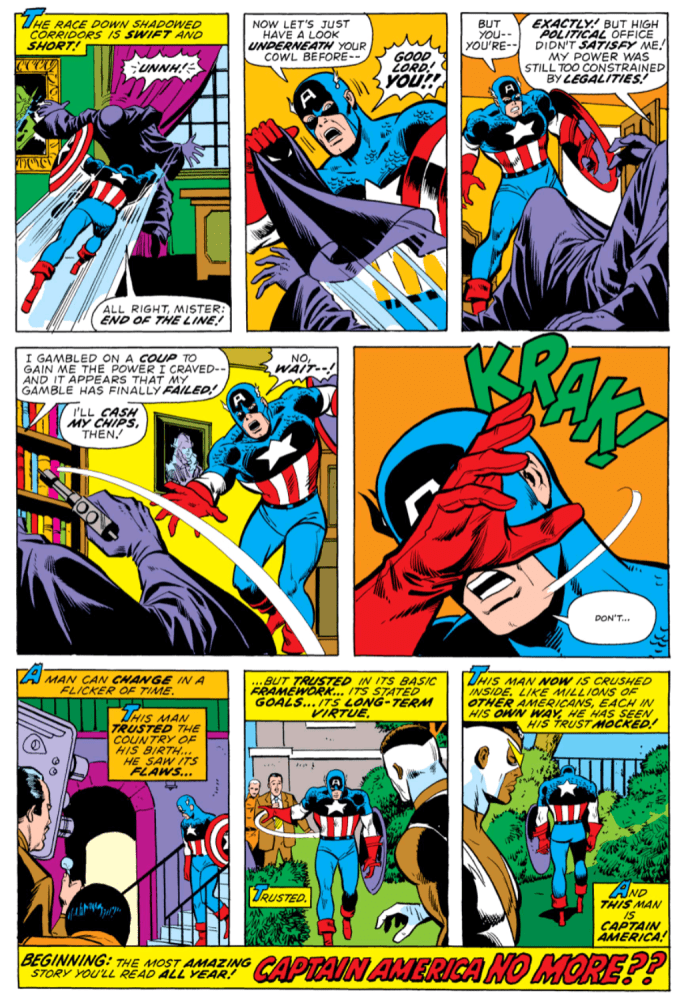That tension explodes in the mid-1970s “Secret Empire” storyline, written by Steve Englehart. Steve and Sam Wilson uncover a conspiracy that isn’t just supervillain chaos. It’s corruption threaded through institutions, aimed at discrediting Captain America and reshaping public opinion. The story builds to a gut punch: Steve chases the conspiracy’s leader into the White House, and the reveal strongly implies the person at the top of the conspiracy is the President. The leader dies by suicide, and Steve is left with the kind of disillusionment you can’t punch your way out of.